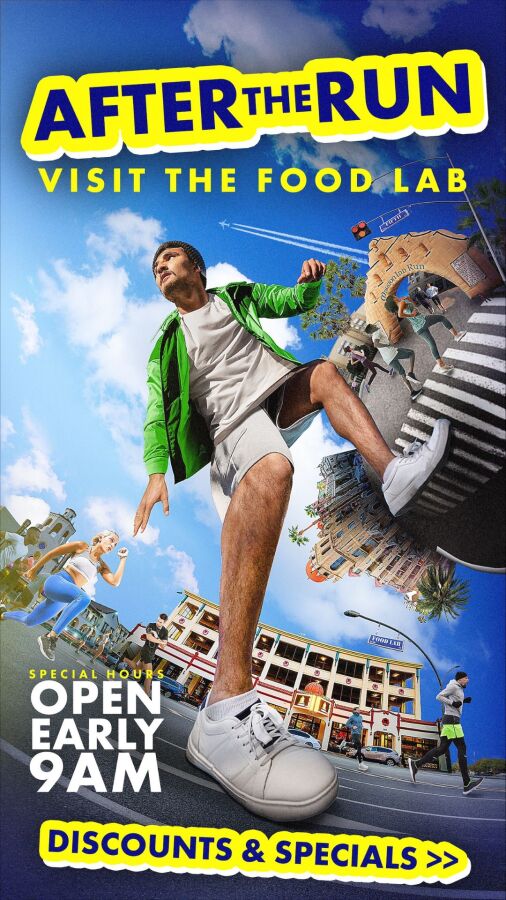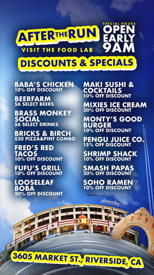 Riverside Food Lab - All restaurants located inside the Food Lab will be offering discounts check the graphic for more detail. Please show your Mission Inn Run bib to receive the discount. See below.